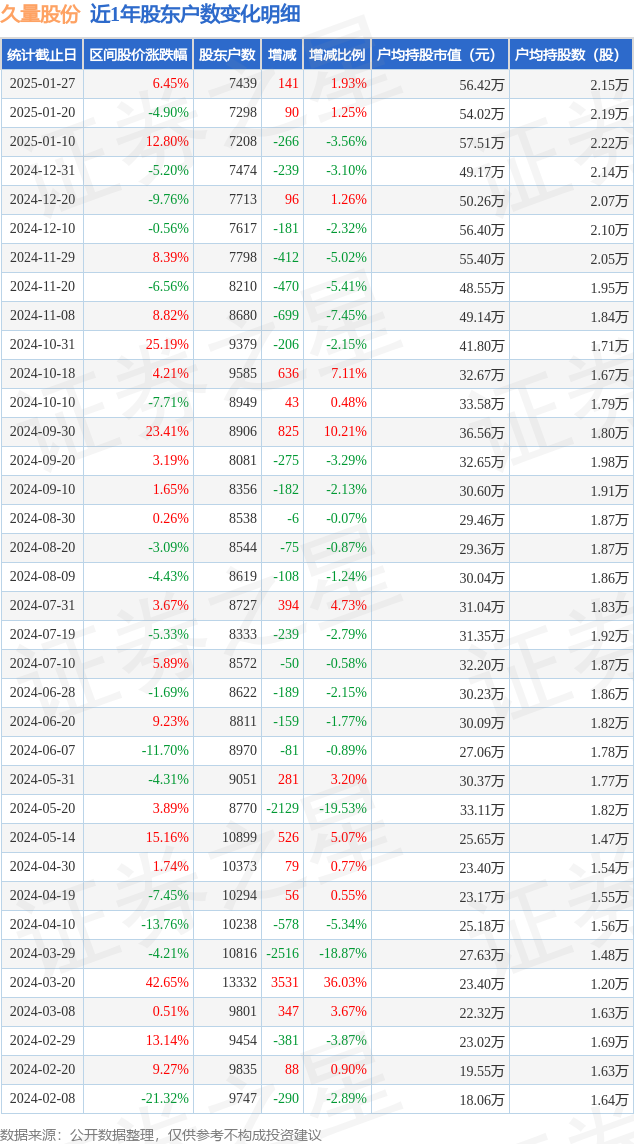 从股价来看,2025年1月20日至2025年1月27日,久量股份区间涨幅为6.45%,在此期间股东户数增加141.0户,增幅为1.93%。