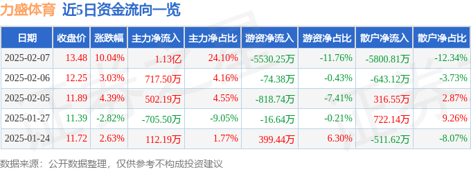 证券之星消息,截至2025年2月7日收盘,力盛体育(002858)报收于13.48元,上涨10.04%,涨停,换手率24.35%,成交量35.72万手,成交额4.7亿元。