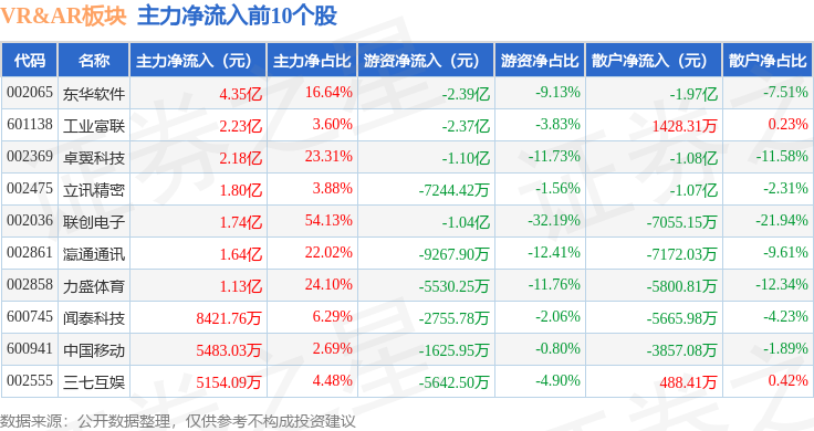 从资金流向上来看,当日VR&AR板块主力资金净流出65.02亿元,游资资金净流入11.95亿元,散户资金净流入53.07亿元。VR&AR板块个股资金流向见下表: