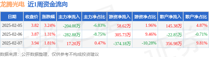 资金流向数据方面,本周龙腾光电主力资金合计净流出469.68万元,游资资金合计净流出9.83万元,散户资金合计净流入479.5万元。本周资金流向一览见下表:
