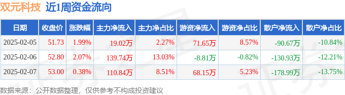 资金流向数据方面,本周双元科技主力资金合计净流入269.6万元,游资资金合计净流入131.0万元,散户资金合计净流出400.59万元。本周资金流向一览见下表: