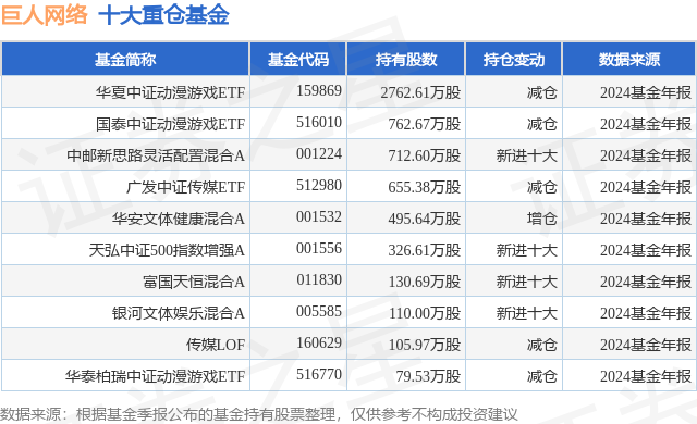 根据2024基金年报公募基金重仓股数据,重仓该股的公募基金共29家,其中持有数量最多的公募基金为华夏中证动漫游戏ETF。华夏中证动漫游戏ETF目前规模为54.14亿元,最新净值1.1371(2月7日),较上一交易日上涨1.76%,近一年上涨34.08%。该公募基金现任基金经理为徐猛。徐猛在任的基金产品包括:华夏恒生ETF联接A,管理时间为2015年12月21日至今,期间收益率为21.64%;华夏恒生ETF(QDII),管理时间为2015年12月21日至今,期间收益率为23.86%;华夏上证50ETF联接A,管理时间为2016年12月1日至今,期间收益率为23.09%;华夏中小企业100ETF,管理时间为2016年12月1日至今,期间收益率为3.86%。