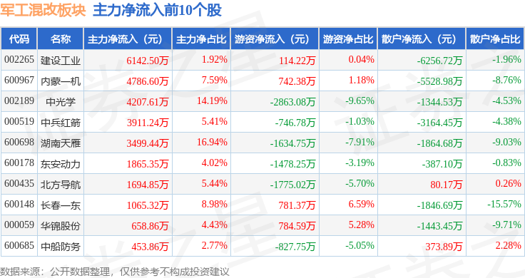 从资金流向上来看,当日军工混改板块主力资金净流出5.91亿元,游资资金净流入2.02亿元,散户资金净流入3.88亿元。军工混改板块个股资金流向见下表: