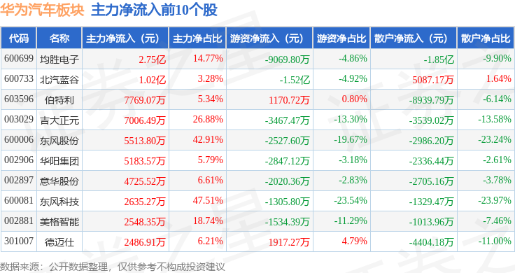 从资金流向上来看,当日华为汽车板块主力资金净流出21.24亿元,游资资金净流入5.26亿元,散户资金净流入15.99亿元。华为汽车板块个股资金流向见下表: