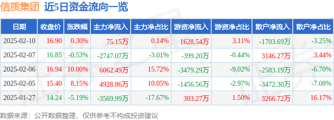 证券之星消息,截至2025年2月10日收盘,信质集团(002664)报收于16.9元,上涨0.3%,换手率7.74%,成交量31.07万手,成交额5.24亿元。