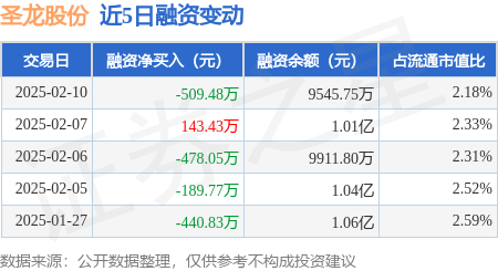 证券之星消息,2月10日,圣龙股份(603178)融资买入319.26万元,融资偿还828.74万元,融资净卖出509.48万元,融资余额9545.75万元。