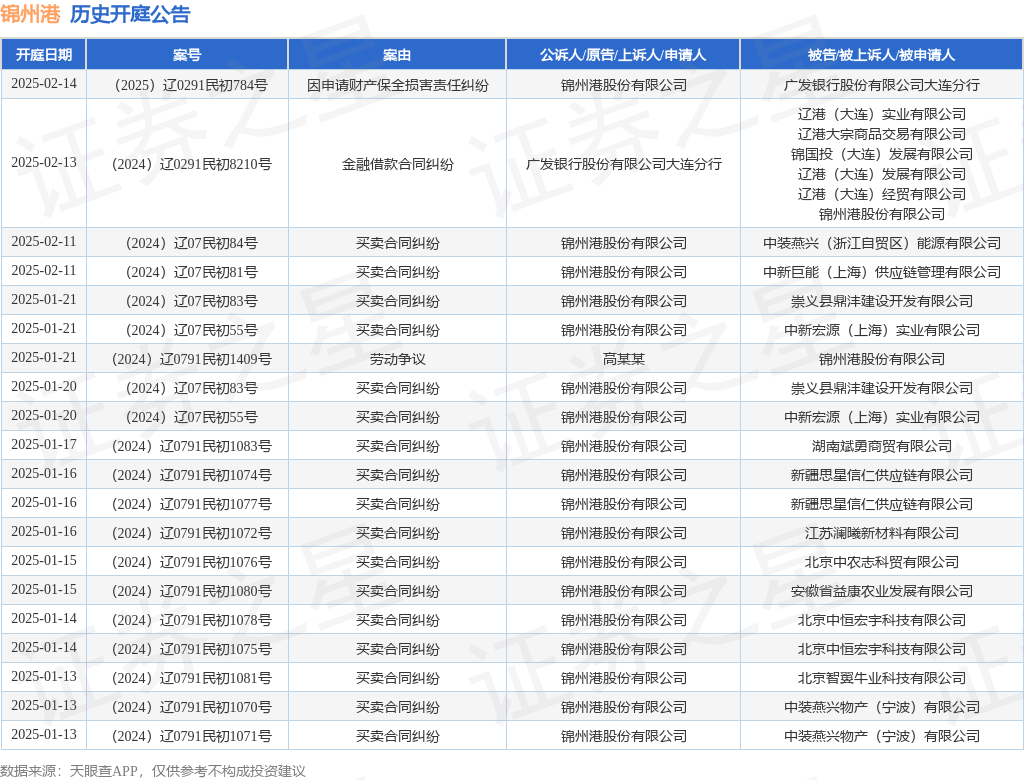 案号:(2025)辽0291民初784号根据统计,近一年内以锦州港股份有限公司为当事人的历史开庭公告有68则,其中案由为“买卖合同纠纷”的公告以44则居首,其次为“建设工程施工合同纠纷”有9则,“证券虚假陈述责任纠纷”有6则。历史开庭公告(前20条)如下: