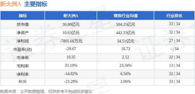 新大洲A2024年三季报显示,公司主营收入5.72亿元,同比下降30.19%;归母净利润-7805.68万元,同比下降27.35%;扣非净利润-6768.08万元,同比下降26.42%;其中2024年第三季度,公司单季度主营收入1.68亿元,同比下降6.47%;单季度归母净利润-5128.55万元,同比下降38.5%;单季度扣非净利润-4846.34万元,同比下降38.75%;负债率60.39%,投资收益-714.59万元,财务费用3352.69万元,毛利率33.19%。新大洲A(000571)主营业务:煤炭采掘业务。