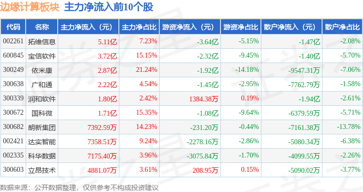 从资金流向上来看,当日边缘计算板块主力资金净流出19.86亿元,游资资金净流入1301.64万元,散户资金净流入19.73亿元。边缘计算板块个股资金流向见下表: