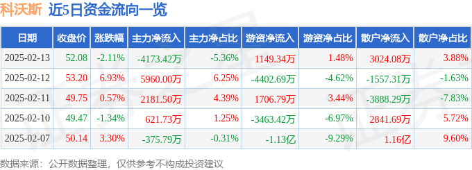 2月13日的资金流向数据方面,主力资金净流出4173.42万元,占总成交额5.36%,游资资金净流入1149.34万元,占总成交额1.48%,散户资金净流入3024.08万元,占总成交额3.88%。
