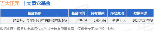 根据2024基金年报公募基金重仓股数据,重仓该股的公募基金共1家,其中持有数量最多的公募基金为建信开元金享6个月持有期债券发起A。建信开元金享6个月持有期债券发起A目前规模为0.66亿元,最新净值1.0218(2月13日),较上一交易日下跌0.22%。该公募基金现任基金经理为袁蓓 江源。袁蓓在任的基金产品包括:建信鑫安回报灵活配置混合A,管理时间为2022年11月25日至今,期间收益率为8.15%;江源在任的基金产品包括:建信鑫安回报灵活配置混合A,管理时间为2022年11月25日至今,期间收益率为8.15%;