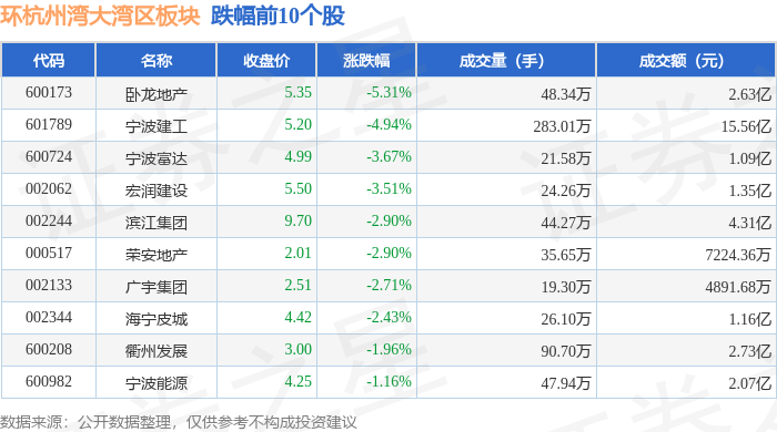 证券之星消息,2月14日环杭州湾大湾区板块较上一交易日下跌0.86%,卧龙地产领跌。当日上证指数报收于3346.72,上涨0.43%。深证成指报收于10749.46,上涨1.16%。环杭州湾大湾区板块个股涨跌见下表: