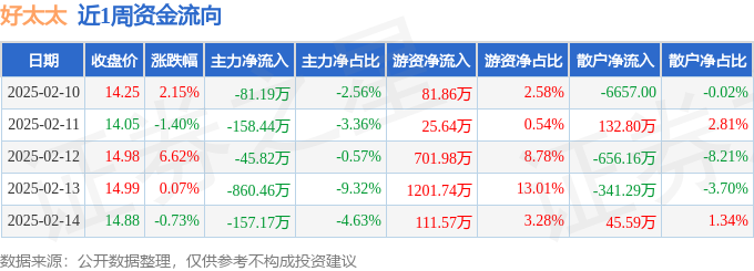 沪深股通持股方面,截止2025年2月14日收盘,好太太沪股通持股数为13.04万股,占流通股比为3.0%。