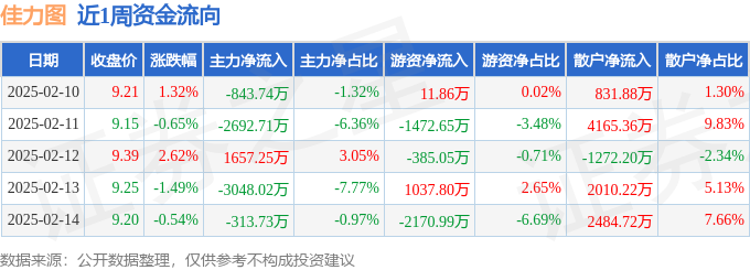 资金流向数据方面,本周佳力图主力资金合计净流出5240.96万元,游资资金合计净流出2979.03万元,散户资金合计净流入8219.98万元。本周资金流向一览见下表:
