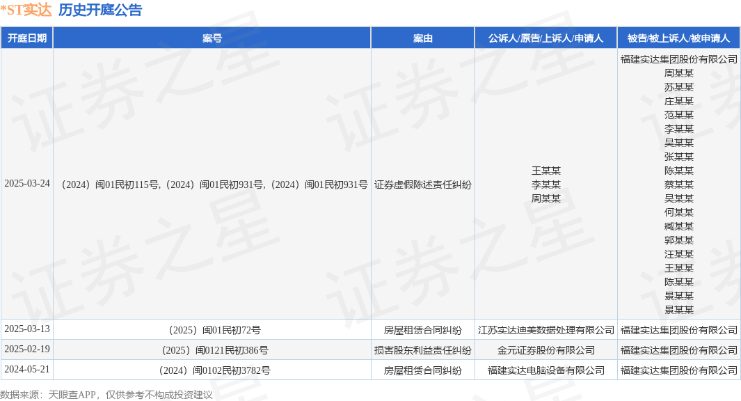案号:(2025)闽0121民初386号根据统计,近一年内以福建实达集团股份有限公司为当事人的历史开庭公告有4则,其中案由为“房屋租赁合同纠纷”的公告以2则居首,其次为“损害股东利益责任纠纷”有1则,“证券虚假陈述责任纠纷”有1则。历史开庭公告如下: