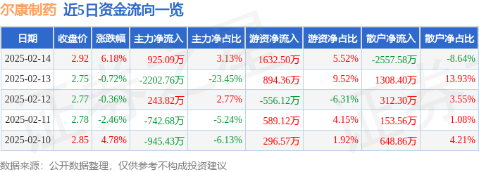 2月14日的资金流向数据方面,主力资金净流入925.09万元,占总成交额3.13%,游资资金净流入1632.5万元,占总成交额5.52%,散户资金净流出2557.58万元,占总成交额8.64%。