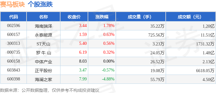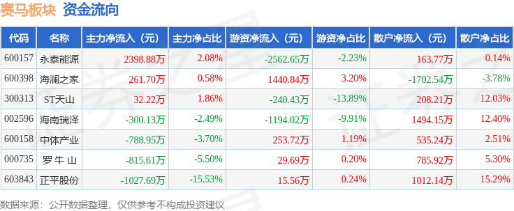 从资金流向上来看,当日赛马板块主力资金净流出239.58万元,游资资金净流出2257.3万元,散户资金净流入2496.88万元。赛马板块个股资金流向见下表:
