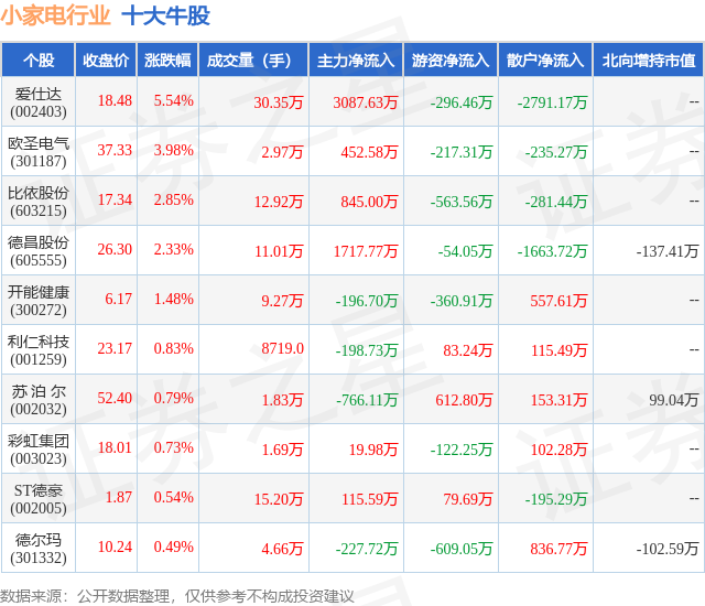 个股表现方面,小家电行业当日领涨股为爱仕达(002403),该股当日报收18.48,上涨5.54%,成交量30.35万,主力资金净流入3087.63万元。欧圣电气(301187)以上涨3.98%紧随其后,该股当日成交量2.97万,主力资金净流入452.58万元。除此之外,比依股份(603215)、德昌股份(605555)、开能健康(300272)均进入当日牛股之列。具体个股列表见下表:
