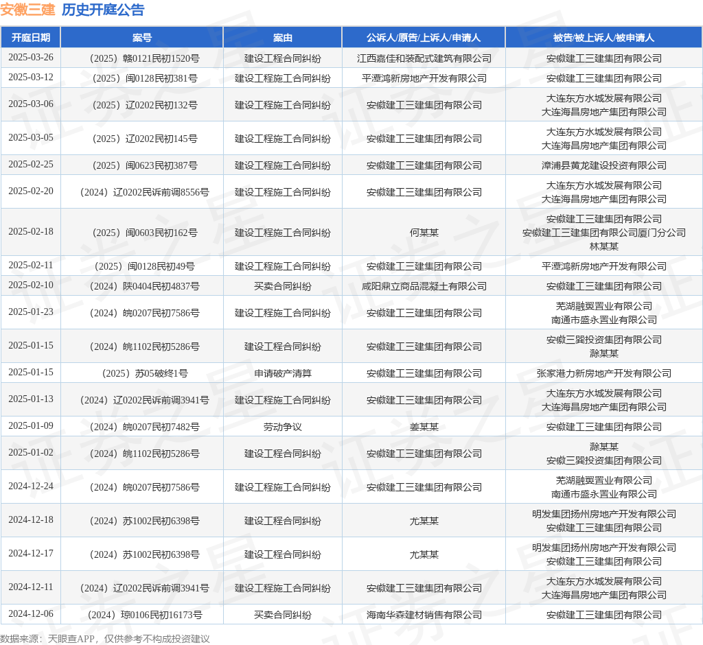 案号:(2024)辽0202民诉前调8556号根据统计,近一年内以安徽建工三建集团有限公司为当事人的历史开庭公告有114则,其中案由为“建设工程施工合同纠纷”的公告以45则居首,其次为“劳动争议”有18则,“建设工程合同纠纷”有15则。历史开庭公告(前20条)如下: