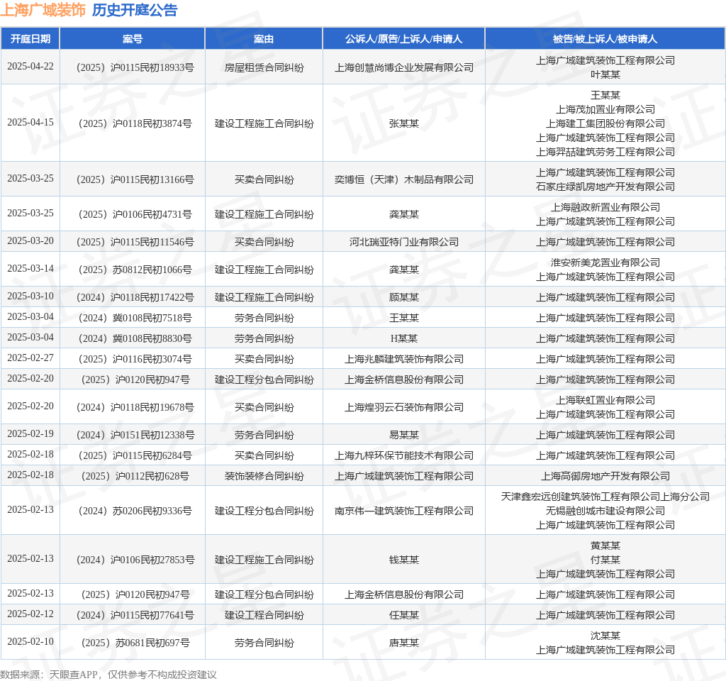案号:(2025)沪0120民初947号根据统计,近一年内以上海广域建筑装饰工程有限公司为当事人的历史开庭公告有257则,其中案由为“买卖合同纠纷”的公告以96则居首,其次为“劳务合同纠纷”有42则,“建设工程分包合同纠纷”有24则。历史开庭公告(前20条)如下: