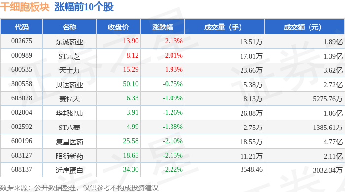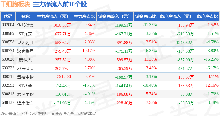 从资金流向上来看,当日干细胞板块主力资金净流出5.66亿元,游资资金净流出6243.31万元,散户资金净流入6.28亿元。干细胞板块个股资金流向见下表: