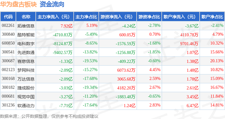 从资金流向上来看,当日华为盘古板块主力资金净流出13.82亿元,游资资金净流出2.13亿元,散户资金净流入15.95亿元。华为盘古板块个股资金流向见下表: