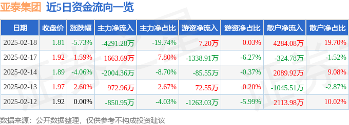 证券之星消息,截至2025年2月18日收盘,亚泰集团(600881)报收于1.81元,下跌5.73%,换手率3.61%,成交量117.41万手,成交额2.17亿元。