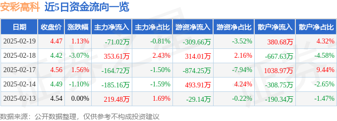 2月19日的资金流向数据方面,主力资金净流出71.02万元,占总成交额0.81%,游资资金净流出309.66万元,占总成交额3.52%,散户资金净流入380.68万元,占总成交额4.32%。