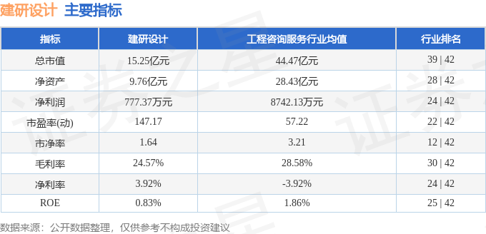 建研设计2024年三季报显示,公司主营收入2.46亿元,同比下降25.86%;归母净利润777.37万元,同比下降78.4%;扣非净利润-187.28万元,同比下降106.57%;其中2024年第三季度,公司单季度主营收入7351.82万元,同比下降45.42%;单季度归母净利润212.17万元,同比下降84.98%;单季度扣非净利润-125.07万元,同比下降111.1%;负债率27.96%,投资收益689.18万元,财务费用-54.06万元,毛利率24.57%。建研设计(301167)主营业务:主要从事建筑设计、咨询、研发及其延伸业务,包括常规建筑设计业务、新兴业务设计与咨询、EPC工程总承包、施工图审查、建筑工程质量检测、合同能源管理等。