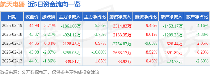 证券之星消息,截至2025年2月19日收盘,航天电器(002025)报收于44.98元,上涨3.71%,换手率1.75%,成交量7.92万手,成交额3.5亿元。
