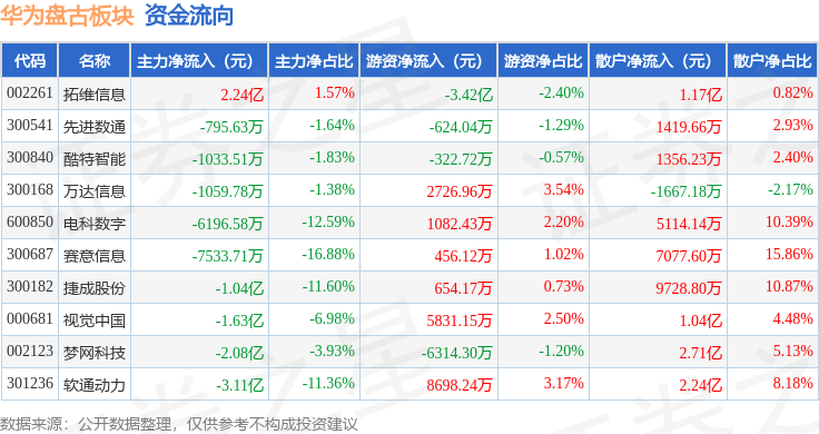 从资金流向上来看,当日华为盘古板块主力资金净流出7.27亿元,游资资金净流出2.2亿元,散户资金净流入9.47亿元。华为盘古板块个股资金流向见下表: