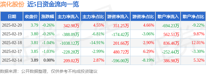 证券之星消息,截至2025年2月20日收盘,滨化股份(601678)报收于3.79元,下跌0.26%,换手率0.98%,成交量19.84万手,成交额7529.9万元。