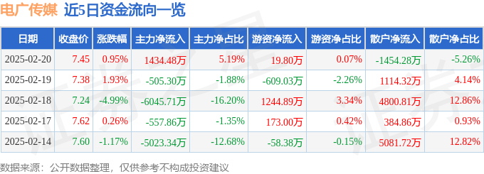 证券之星消息,截至2025年2月20日收盘,电广传媒(000917)报收于7.45元,上涨0.95%,换手率2.63%,成交量37.21万手,成交额2.76亿元。