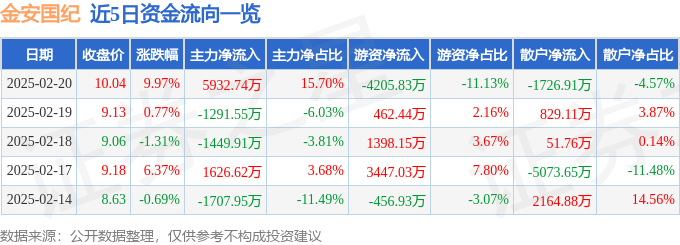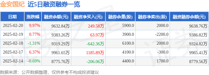 证券之星消息,截至2025年2月20日收盘,金安国纪(002636)报收于10.04元,上涨9.97%,涨停,换手率5.52%,成交量39.95万手,成交额3.78亿元。