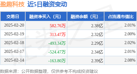 证券之星消息,2月20日,盈趣科技(002925)融资买入2902.29万元,融资偿还2319.53万元,融资净买入582.76万元,融资余额2.38亿元。