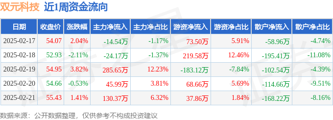 资金流向数据方面,本周双元科技主力资金合计净流入423.31万元,游资资金合计净流入216.48万元,散户资金合计净流出639.78万元。本周资金流向一览见下表:
