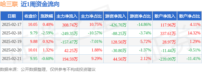 资金流向数据方面,本周哈三联主力资金合计净流入138.74万元,游资资金合计净流出372.76万元,散户资金合计净流入234.01万元。本周资金流向一览见下表: