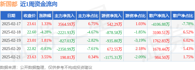 资金流向数据方面,本周新国都主力资金合计净流出1644.54万元,游资资金合计净流出1774.85万元,散户资金合计净流入3419.4万元。本周资金流向一览见下表: