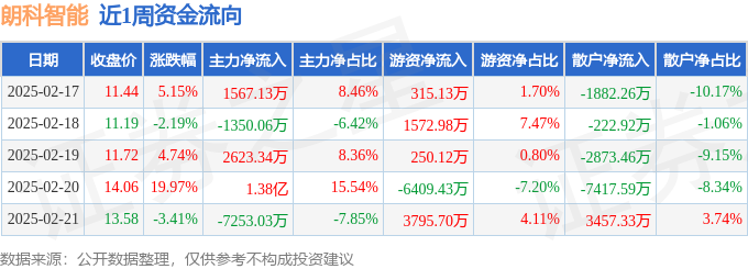 资金流向数据方面,本周朗科智能主力资金合计净流入9414.38万元,游资资金合计净流出475.48万元,散户资金合计净流出8938.9万元。本周资金流向一览见下表: