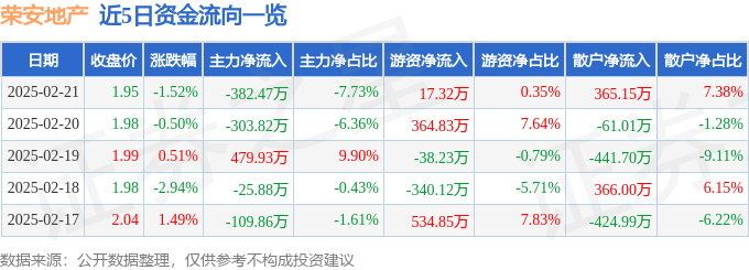 证券之星消息,截至2025年2月21日收盘,荣安地产(000517)报收于1.95元,下跌1.52%,换手率1.01%,成交量25.25万手,成交额4946.72万元。