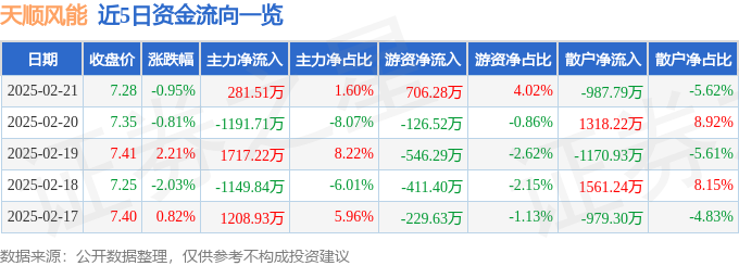 证券之星消息,截至2025年2月21日收盘,天顺风能(002531)报收于7.28元,下跌0.95%,换手率1.35%,成交量24.17万手,成交额1.76亿元。