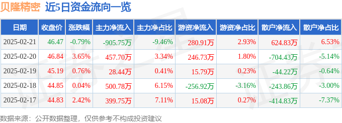 证券之星消息,截至2025年2月21日收盘,贝隆精密(301567)报收于46.47元,下跌0.79%,换手率9.75%,成交量2.07万手,成交额9572.0万元。