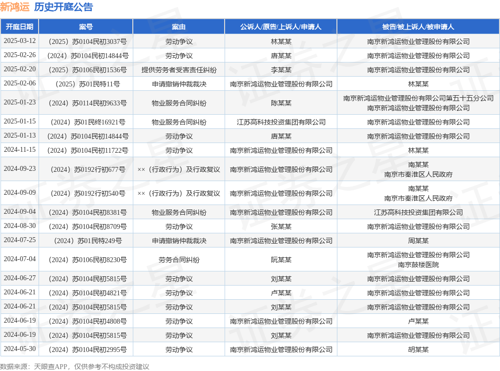 证券之星消息,根据天眼查APP显示,近日公布了一则南京新鸿运物业管理股份有限公司作为被告/被上诉人的开庭公告,详细内容如下: