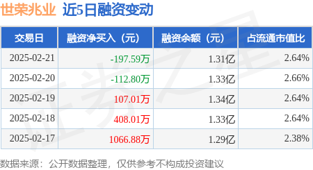 证券之星消息,2月21日,世荣兆业(002016)融资买入773.14万元,融资偿还970.73万元,融资净卖出197.59万元,融资余额1.31亿元。