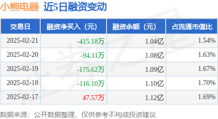证券之星消息,2月21日,小熊电器(002959)融资买入745.92万元,融资偿还1161.1万元,融资净卖出415.18万元,融资余额1.04亿元,近20个交易日中有11个交易日出现融资净买入。