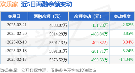 证券之星消息,2月21日,欢乐家(300997)融资买入503.09万元,融资偿还634.31万元,融资净卖出131.23万元,融资余额4883.07万元。