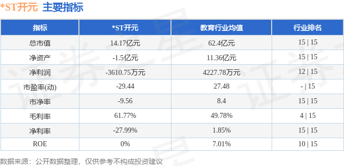 *ST开元2024年三季报显示,公司主营收入1.4亿元,同比下降52.21%;归母净利润-3610.75万元,同比下降10.08%;扣非净利润-3332.5万元,同比下降3.73%;其中2024年第三季度,公司单季度主营收入4210.95万元,同比下降45.96%;单季度归母净利润-1809.06万元,同比上升35.56%;单季度扣非净利润-1785.2万元,同比上升39.34%;负债率133.58%,投资收益2285.44万元,财务费用803.72万元,毛利率61.77%。*ST开元(300338)主营业务:职业教育和新能源业务。
