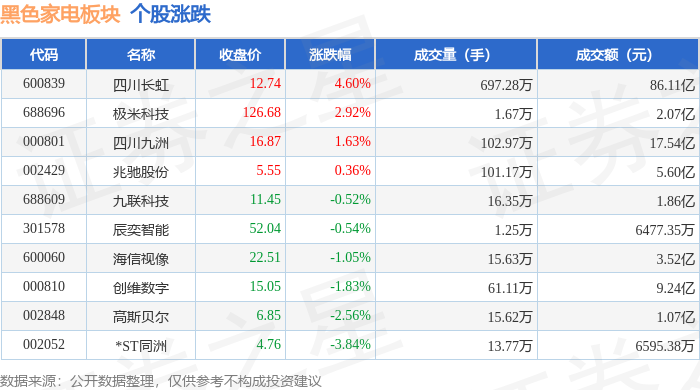 证券之星消息,2月24日黑色家电板块较上一交易日上涨1.44%,四川长虹领涨。当日上证指数报收于3373.03,下跌0.18%。深证成指报收于10983.04,下跌0.08%。黑色家电板块个股涨跌见下表: