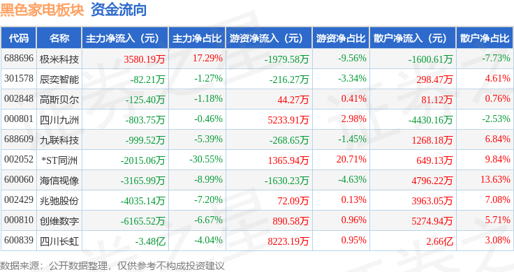 从资金流向上来看,当日黑色家电板块主力资金净流出4.86亿元,游资资金净流入1.17亿元,散户资金净流入3.69亿元。黑色家电板块个股资金流向见下表: