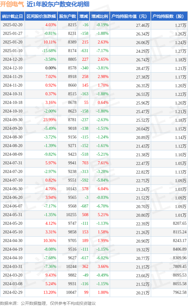从股价来看,2025年1月27日至2025年2月20日,开创电气区间涨幅为4.03%,在此期间股东户数减少16.0户,减幅为0.19%。